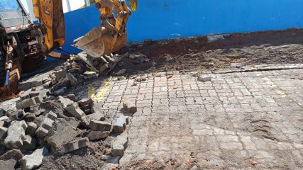 Tiago comentou que inicialmente a ideia é ter começado ontem, mas foi adiado por conta das condições climáticas. Então os trabalhos foram iniciado hoje e a expectativa é que seja finalizada essa derrubada parcial do muro até amanhã.