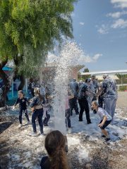 Ao final, as crianças participaram de um momento recreativo com espuma, tornando a experiência mais leve e próxima da realidade operacional dos bombeiros. A ação contemplou cerca de 60 alunos, proporcionando um momento de aprendizado e aproximação entre os estudantes e a corporação.