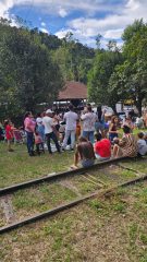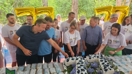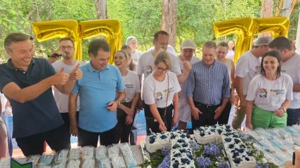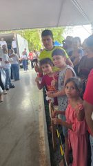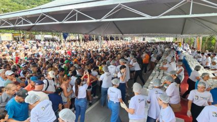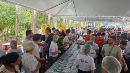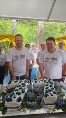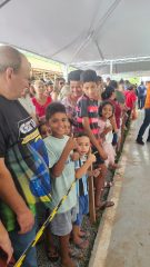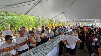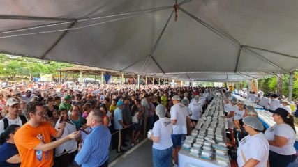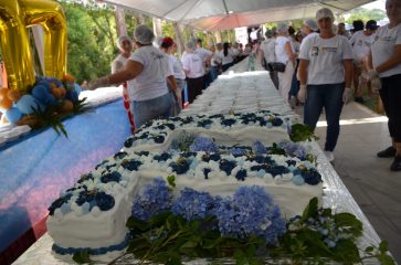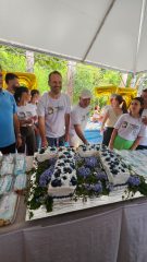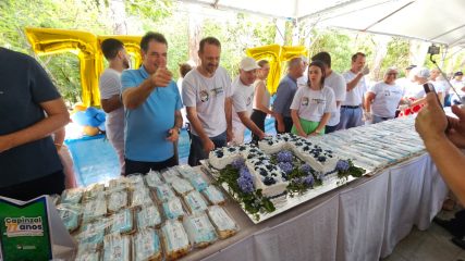 Dando sequência à programação festiva, foi realizado o tradicional corte do bolo, seguido pela distribuição de bolo e galeto ao público. As crianças puderam aproveitar brinquedos infláveis, além da distribuição de pipoca, algodão doce e picolés.