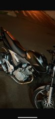 Trata-se de uma Honda CG 150 Titan Sport, de cor preta, com marcas de uso no tanque, roda da frente grafite escura e a roda traseira com pintura preta.