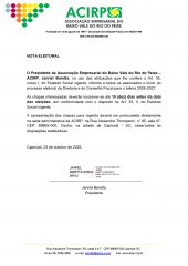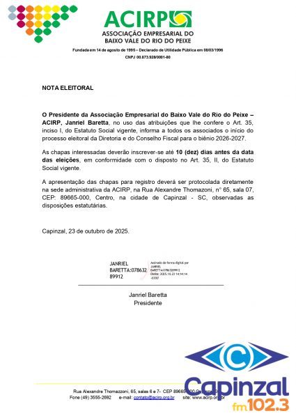 O Presidente da Associação Empresarial do Baixo Vale do Rio do Peixe – ACIRP, Janriel Baretta, no uso das atribuições que lhe confere o Art. 35,inciso I, do Estatuto Social vigente, informa a todos os associados o início do processo eleitoral da Diretoria e do Conselho Fiscal para o biênio 2026-2027.