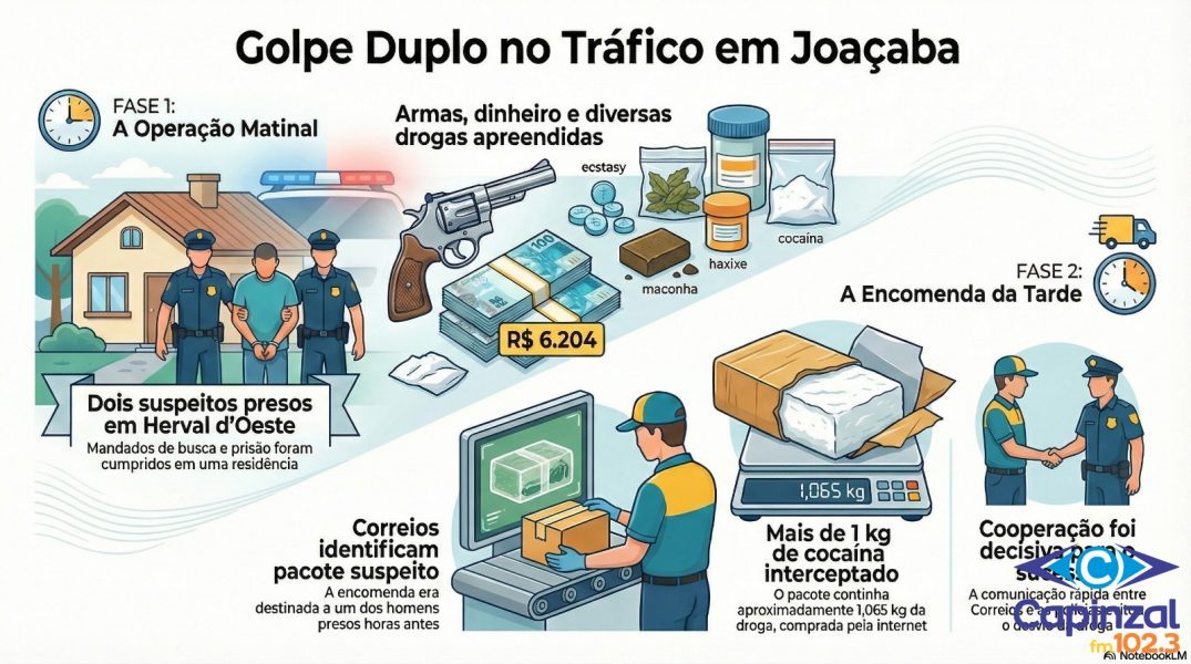 Segundo o delegado da DIC de Joaçaba, Gilmar Bonamigo, a operação da manhã e a interceptação da encomenda fazem parte de um mesmo conjunto de investigações conduzidas pela Polícia Civil. Conforme destacou a corporação, a rápida atuação dos Correios, aliada ao apoio da Polícia Militar e da Polícia Penal, foi fundamental para evitar que a droga fosse desviada ou retirada por terceiros.