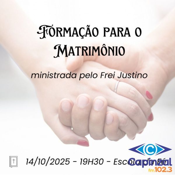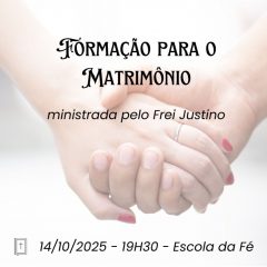 A Pastoral Familiar da Paróquia São Paulo Apóstolo promove, na noite desta terça-feira, 14 de outubro, na Escola da Fé, a partir das 19h, um encontro de “Formação para o Matrimônio”, que será conduzido pelo pároco Frei Justino Felix Stolf.