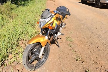 A motocicleta foi recolhida e encaminhada ao destacamento da Polícia Militar. A Polícia Civil foi comunicada e orientou que o veículo permanecesse no local para posterior apresentação à perícia. O proprietário compareceu ao destacamento para os procedimentos cabíveis.