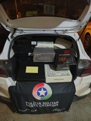 Após consulta aos sistemas, foi constatado que o veículo pertencia a uma empresa de locação, aumentando a desconfiança de transporte irregular. O carro foi acompanhado e abordado logo em seguida. O veículo era conduzido por um homem de 25 anos, tendo como passageiro o pai, de 43 anos.
