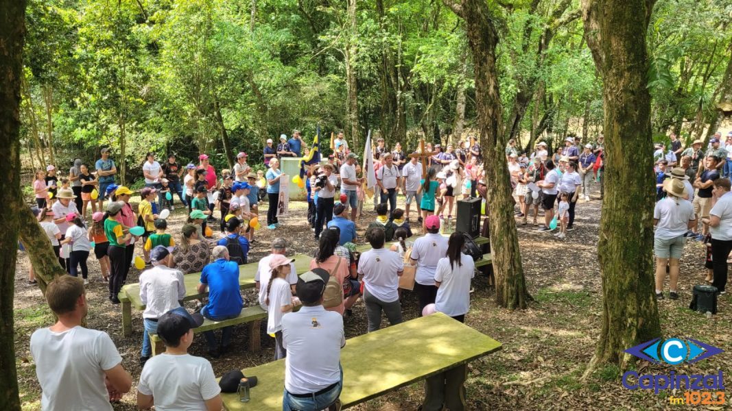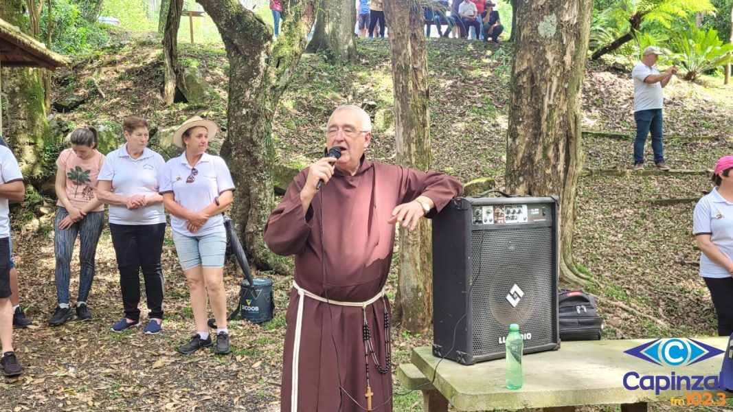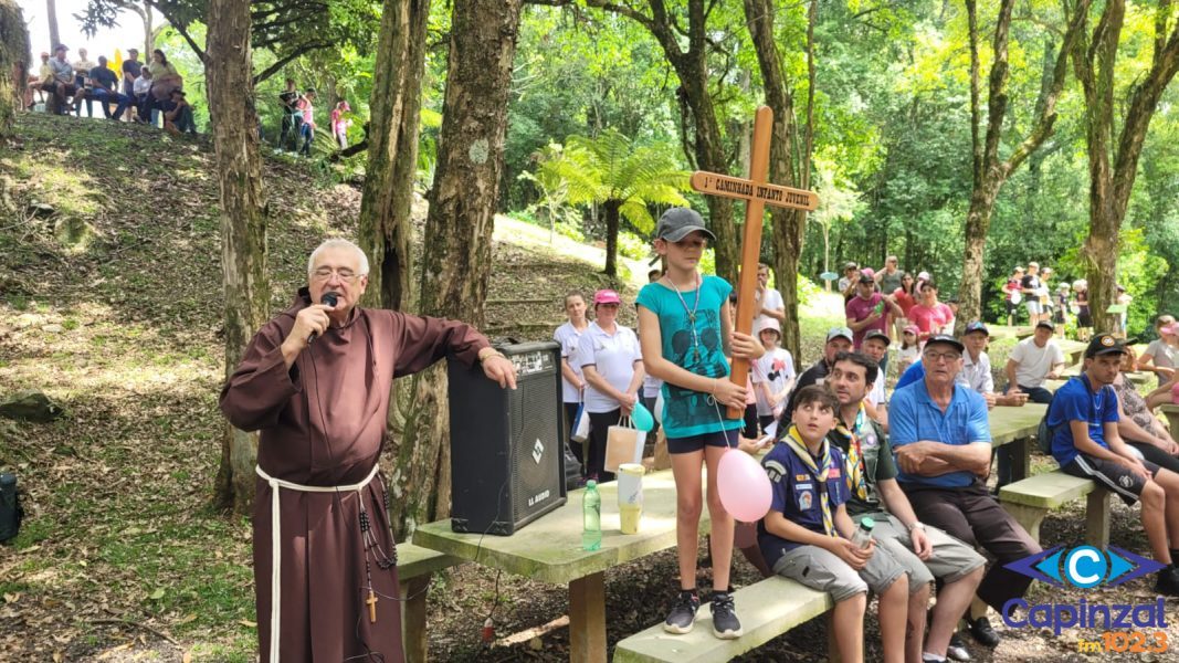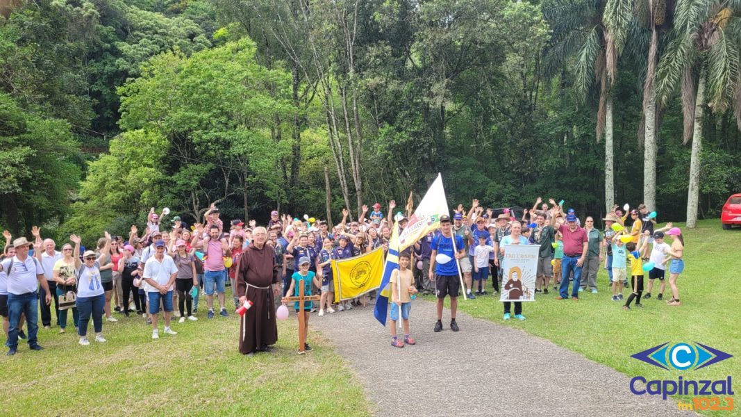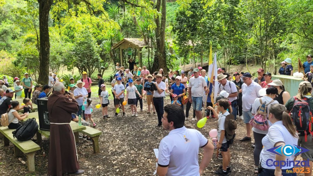 A concentração ocorreu às 14h, em frente à Gruta de Nossa Senhora de Lourdes, em Linha Leãozinho. O Frei Ivo Lazzarotto deu as boas-vindas aos presentes, destacou os objetivos da caminhada devocional e conduziu um momento de oração antes da saída.