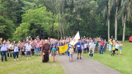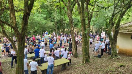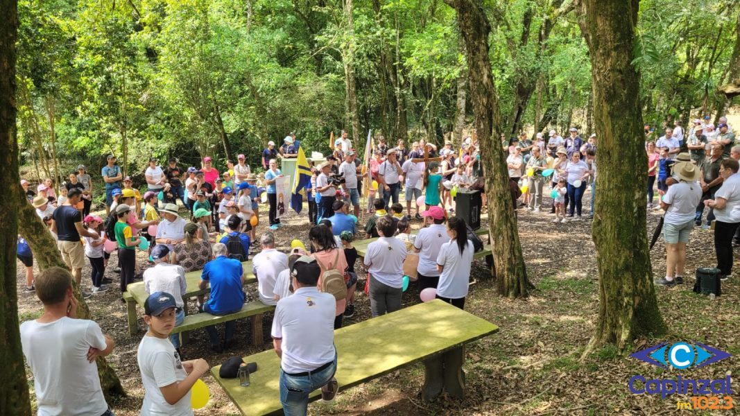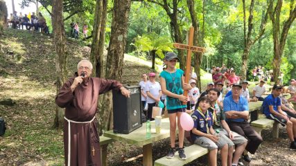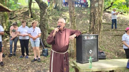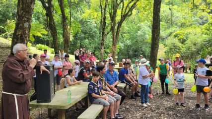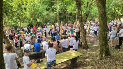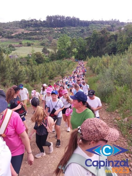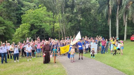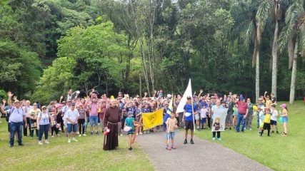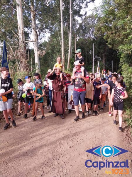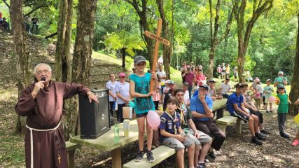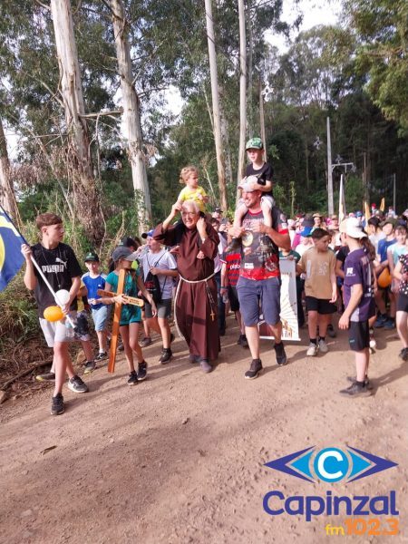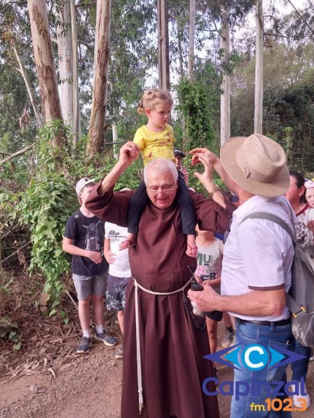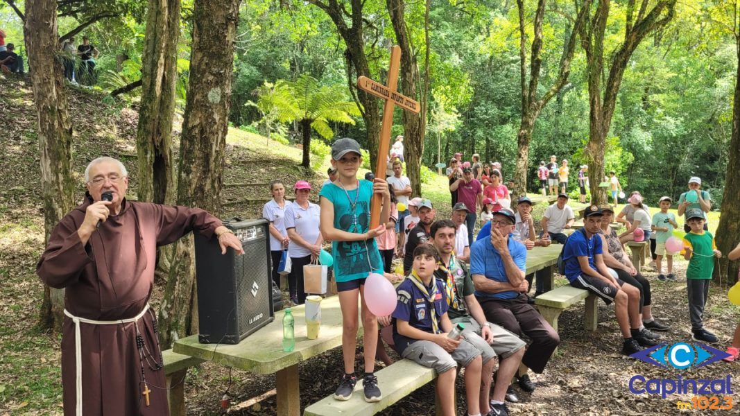 A concentração ocorreu às 14h, em frente à Gruta de Nossa Senhora de Lourdes, em Linha Leãozinho. O Frei Ivo Lazzarotto deu as boas-vindas aos presentes, destacou os objetivos da caminhada devocional e conduziu um momento de oração antes da saída.