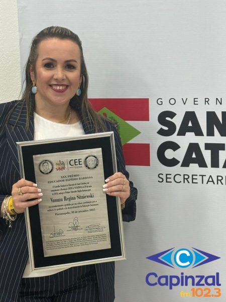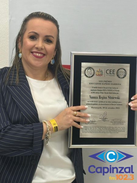 Indicada no dia 19 de setembro ao Prêmio Educador Elpídio Barbosa, em sua XXX edição, a professora Vanuza Regina Sitniewski recebeu, na noite de terça-feira, 30 de setembro, em São José, o título que reconhece sua trajetória, representando a Coordenadoria Regional de Educação (CRE) de Joaçaba.