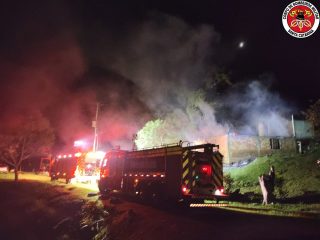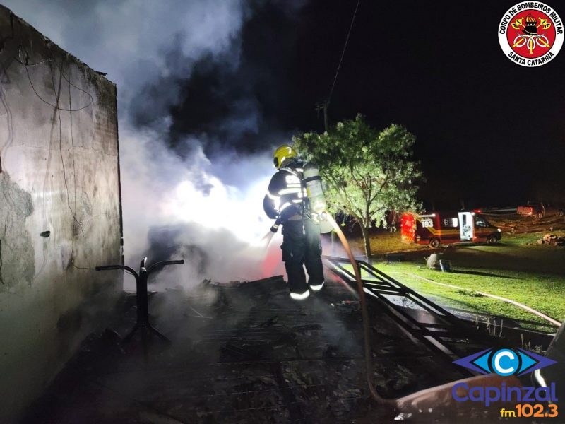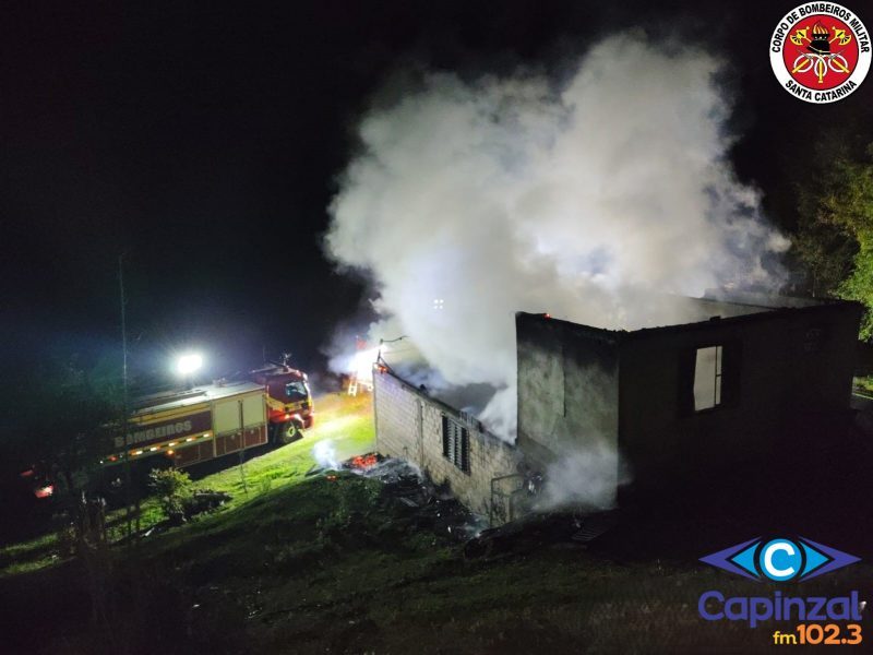 Um incêndio de grandes proporções destruiu uma residência na madrugada desta quarta-feira, dia 12, na comunidade de Barro Preto, interior de Fraiburgo, nas proximidades da pedreira da Aterplan.