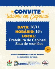 A Secretaria de Desenvolvimento Econômico, Inovação e Turismo de Capinzal promove nesta sexta-feira, 28 de novembro, uma reunião destinada aos interessados em atuar no turismo do município. O encontro está marcado para as 16h, na sala de reuniões da Prefeitura de Capinzal.