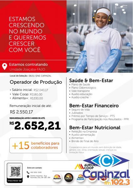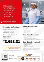 Já a Aurora, unidade de Joaçaba, está contratando 30 operadores de produção, com remuneração inicial de até R$ 2.550,17 e benefícios como plano de saúde, vale-transporte, auxílio-alimentação e programa de participação nos resultados. A seleção ocorrerá no dia 04 de dezembro.