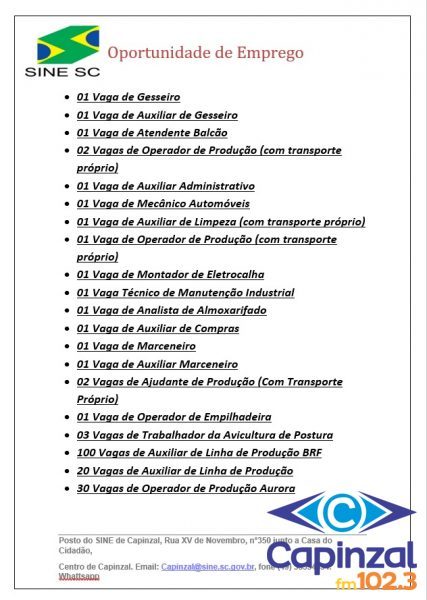 O Sine de Capinzal divulgou nesta sexta-feira, dia 7 de novembro, novas oportunidades de emprego disponíveis no município e região. As vagas contemplam diferentes níveis de escolaridade e áreas de atuação, com destaque para as indústrias BRF, Aurora e Gratt Indústria e Tecnologia Ambiental, que estão com processos seletivos abertos.