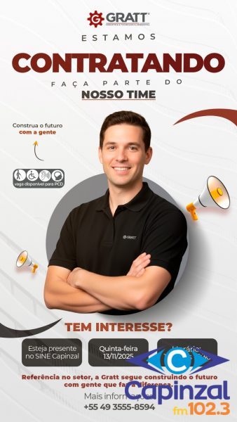A Gratt, com sede em Capinzal, também está com seleção marcada para quinta-feira, dia 13 de novembro, das 13h às 16h30, no Sine. A empresa oferece oportunidades inclusive para pessoas com deficiência (PCDs).